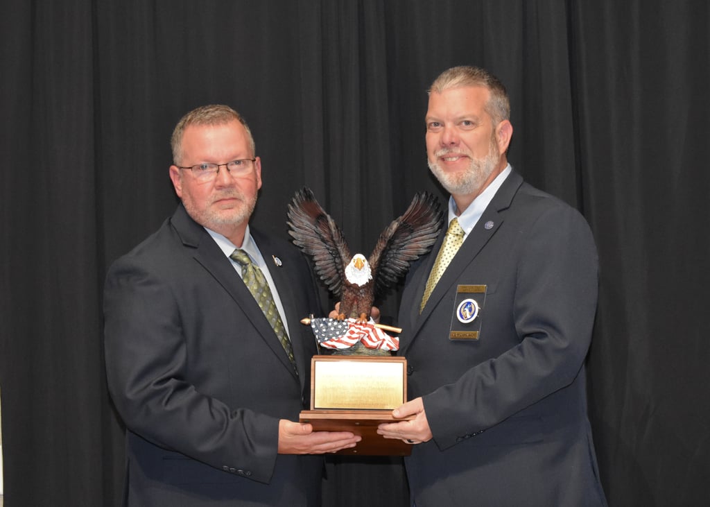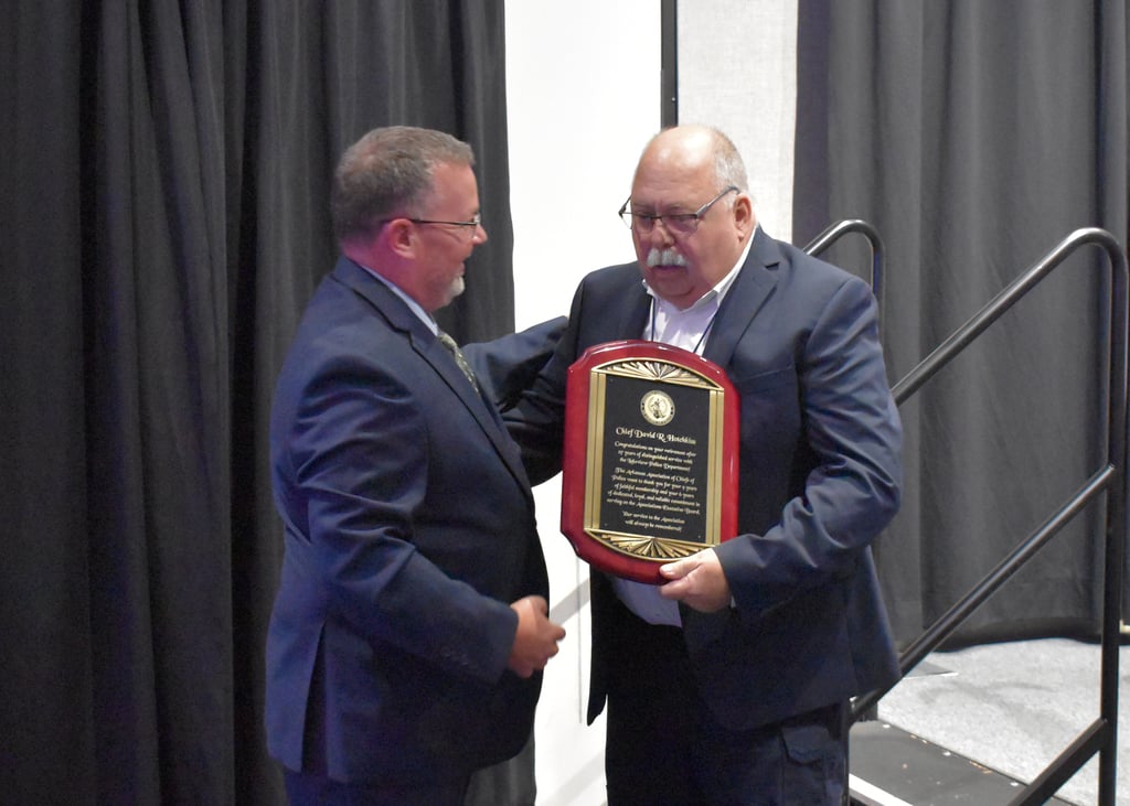 Chief Ewing presents Past President Chief David Hotchkiss with a plaque and congratulating him on his upcoming retirement in November