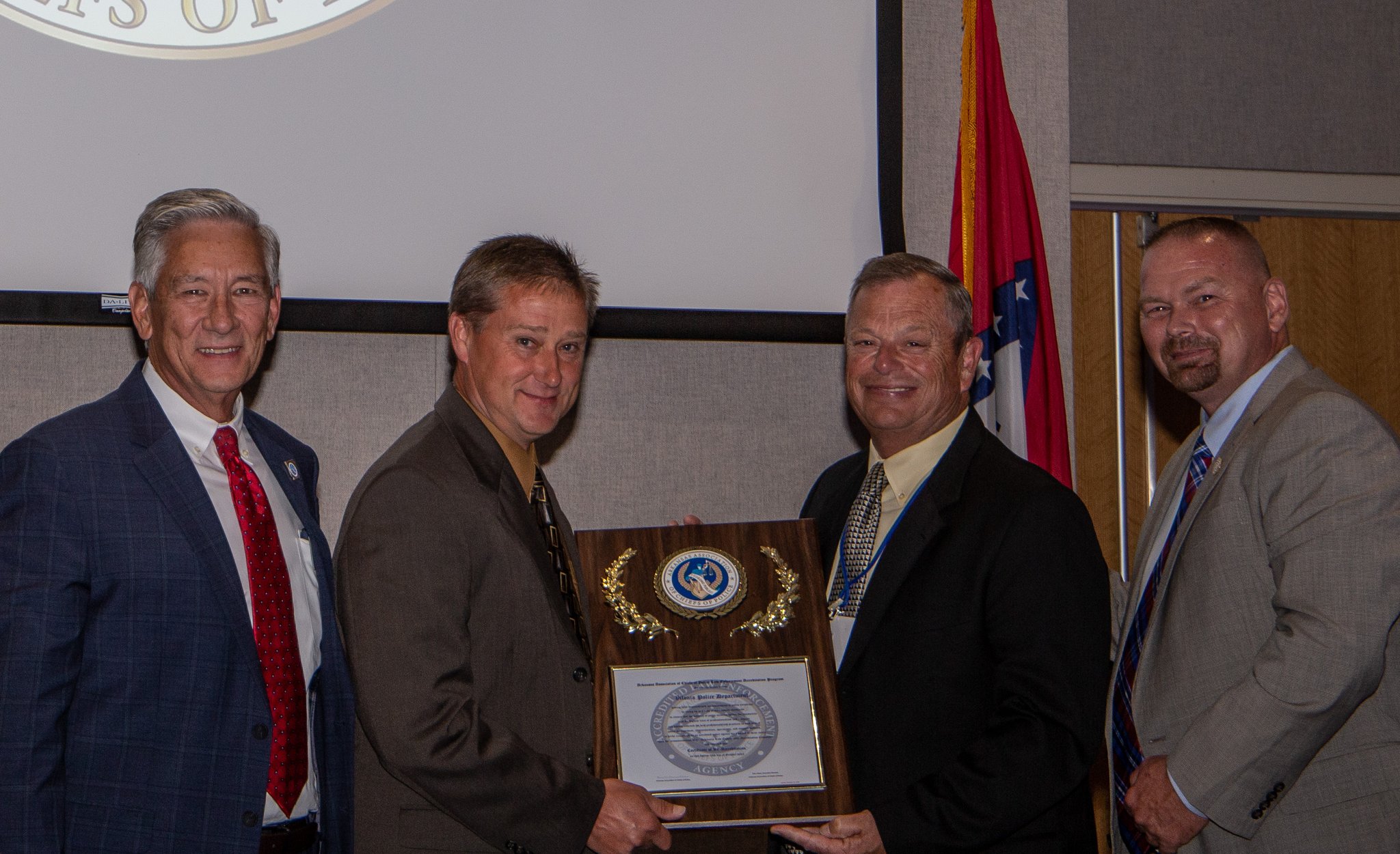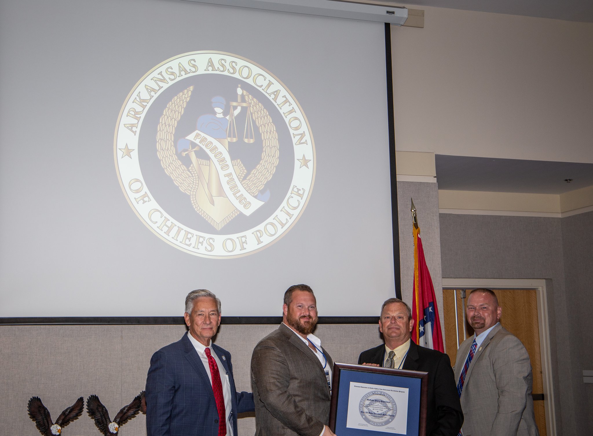 Pictured left to right: Asst. Chief Trent Anderson, Morrilton PD, Chief Kyn Wilson (Ret.), Officer Frankie Tucker, Clarksville PD AACP 1st VP, Chief David Ewing, Russellville PD presents the award, Asst. Chief Aaron Arnold, Clarksville PD